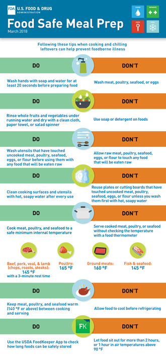 When you prepare meals and snacks for yourself, your family, and your friends, it is important to follow simple food safety tips to help prevent foodborne illness, also known as "food poisoning." Whether you are a home cook, a professional chef, or a recipe writer, there are some easy steps you can take to help keep your food safe all the way from the grocery store to the kitchen table.